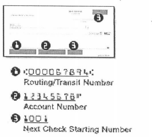 Below is a sample of a check MICR line, detailing where the necessary information to complete this form can be found.